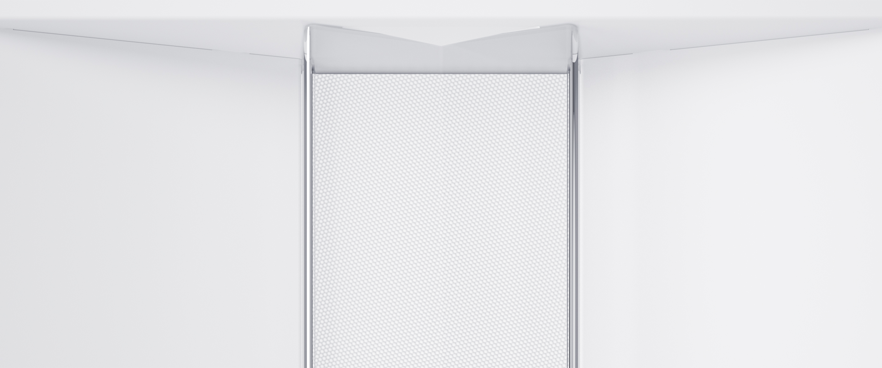 Delta – microprism louvre in acrylic (PMMA) with a thin opal diffuser in acrylic (PMMA) on the inside (PMMA). Light divider in acrylic (PMMA).