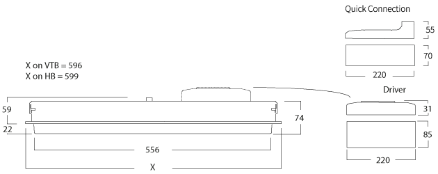 Connection in separate ballast box. Snap-in terminal block 3x1,5 mm² (x2), through-wiring possible. 5x1,5 mm² (x2) when dimming. Can also be supplied with mains cable and earthed plug or chassis mounted snap-in connector. The luminaire housing and driver are connected via a Quick Connection System.