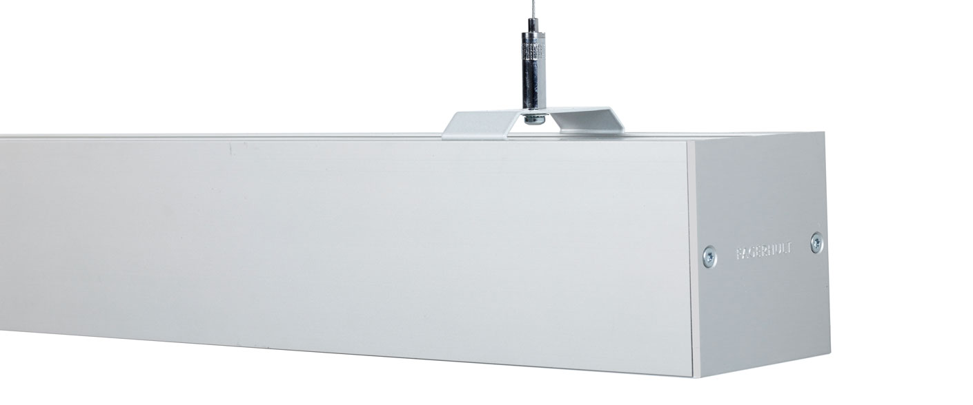 Designed for single or continuous installation via a wire pendent and special loops that give flexible c-c spacing. Special loops included in the delivery. Wires suspension are ordered separately. Can also be wall mounted with special bracket, see Accessories.