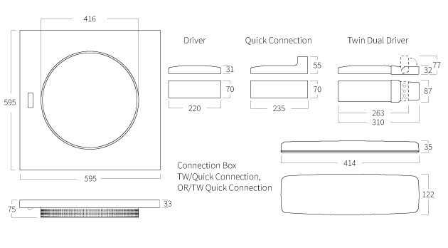 Connected to 2.5 mm² 3-way terminal block 3x1.5 mm² (x2), with the possibility of through-wiring. 5x1.5 mm² (x2) when dimming. Can also be supplied with mains cable and earthed plug or chassis mounted snap-in connector.