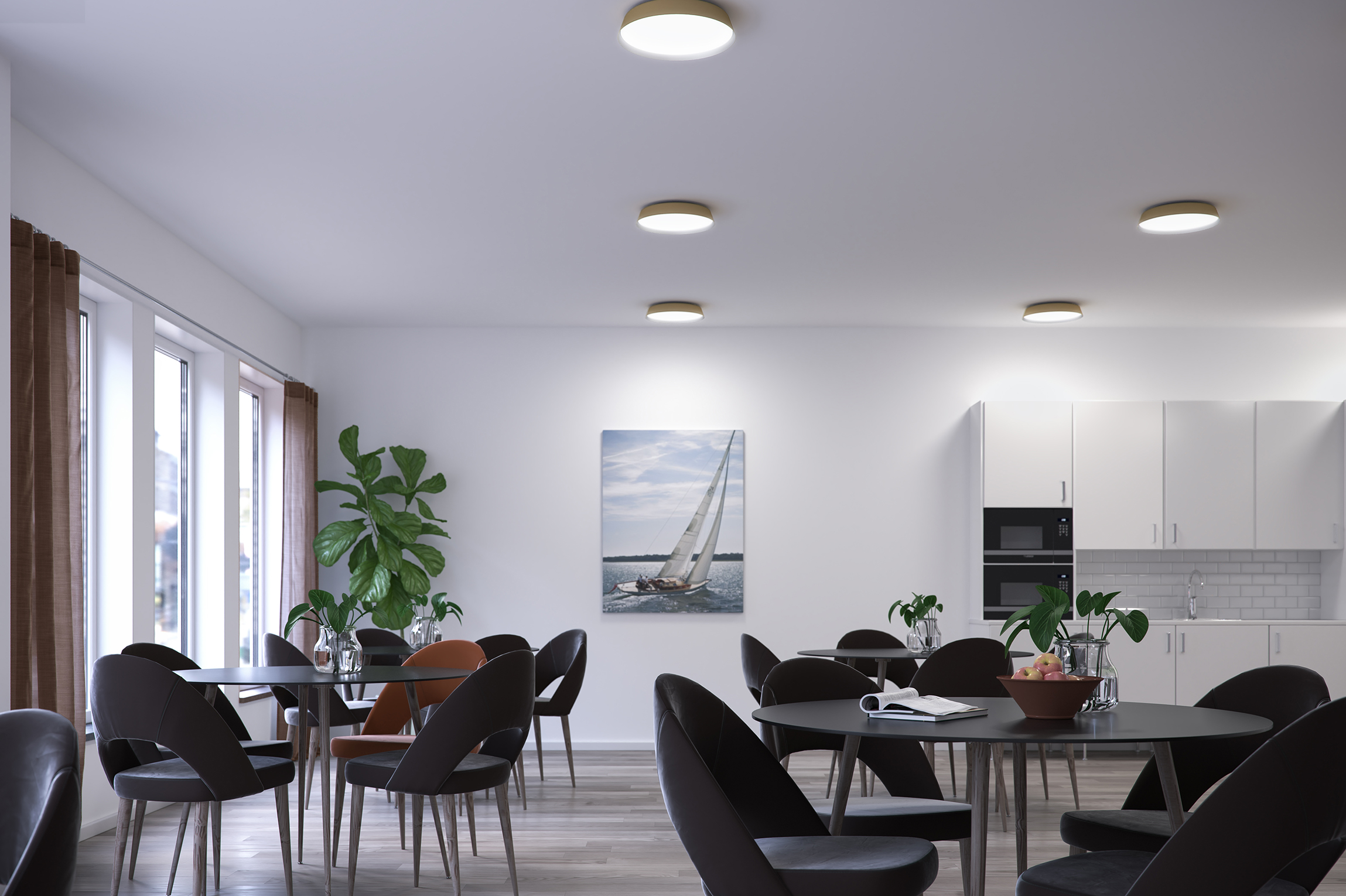 Zur Decken- oder Wandmontage. Ø 520 mm – drei Befestigungslöcher. Ø 360/420 mm – zwei Befestigungslöcher. Einbau in Decken mit Dekorring – IP44 Ohne Dekorring – IP41 Dauerhafte Wandmontage – IP40.
