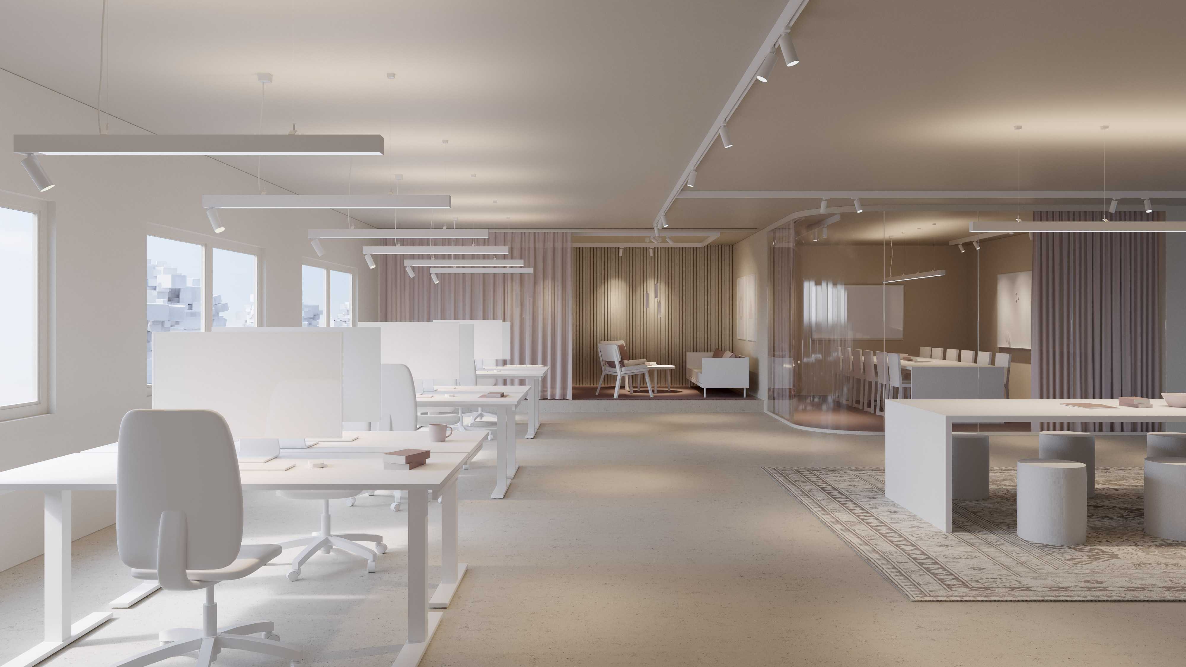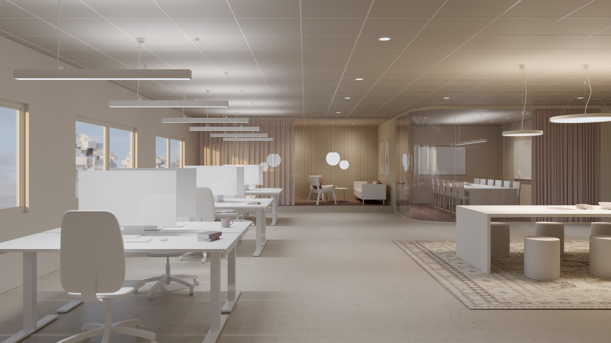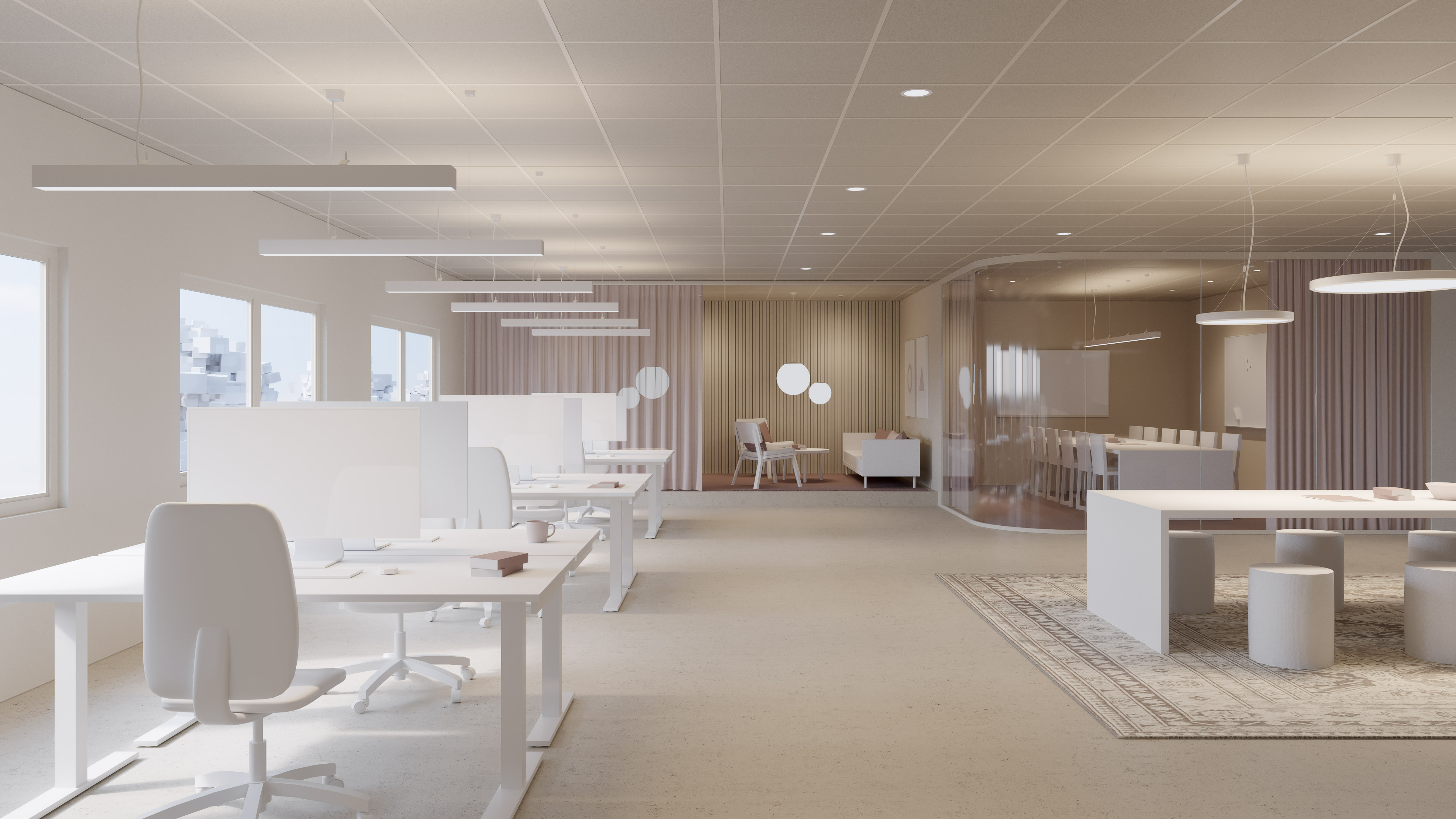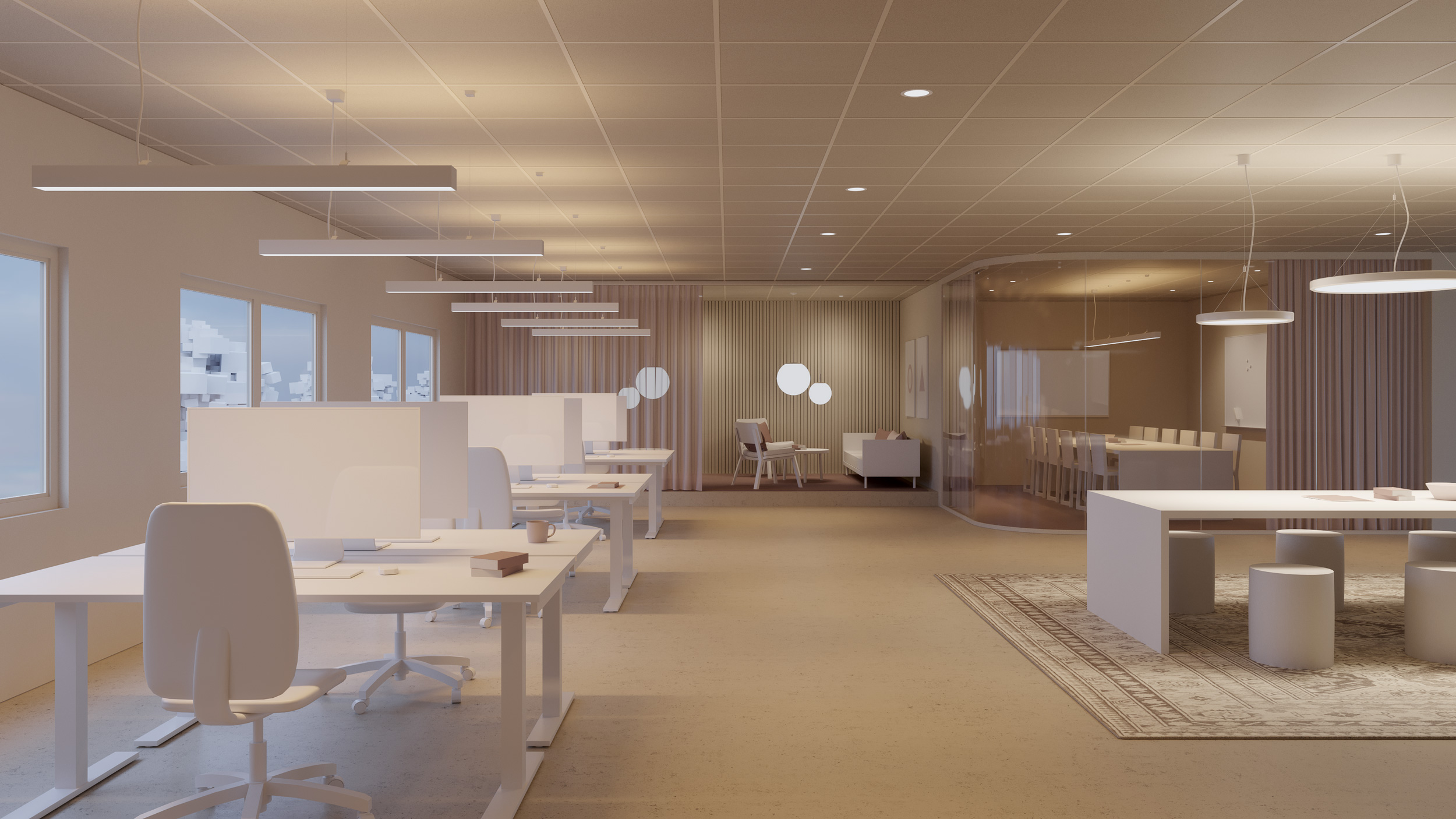 We recommend a suspended lighting solution over the surfaces used as workplaces. Suspended luminaires with a direct/indirect lighting provide a glare-free and comfortable working environment for the individual and improve conditions for concentration and focus. They also provide the opportunity for personalisation and control of the individual luminaire.