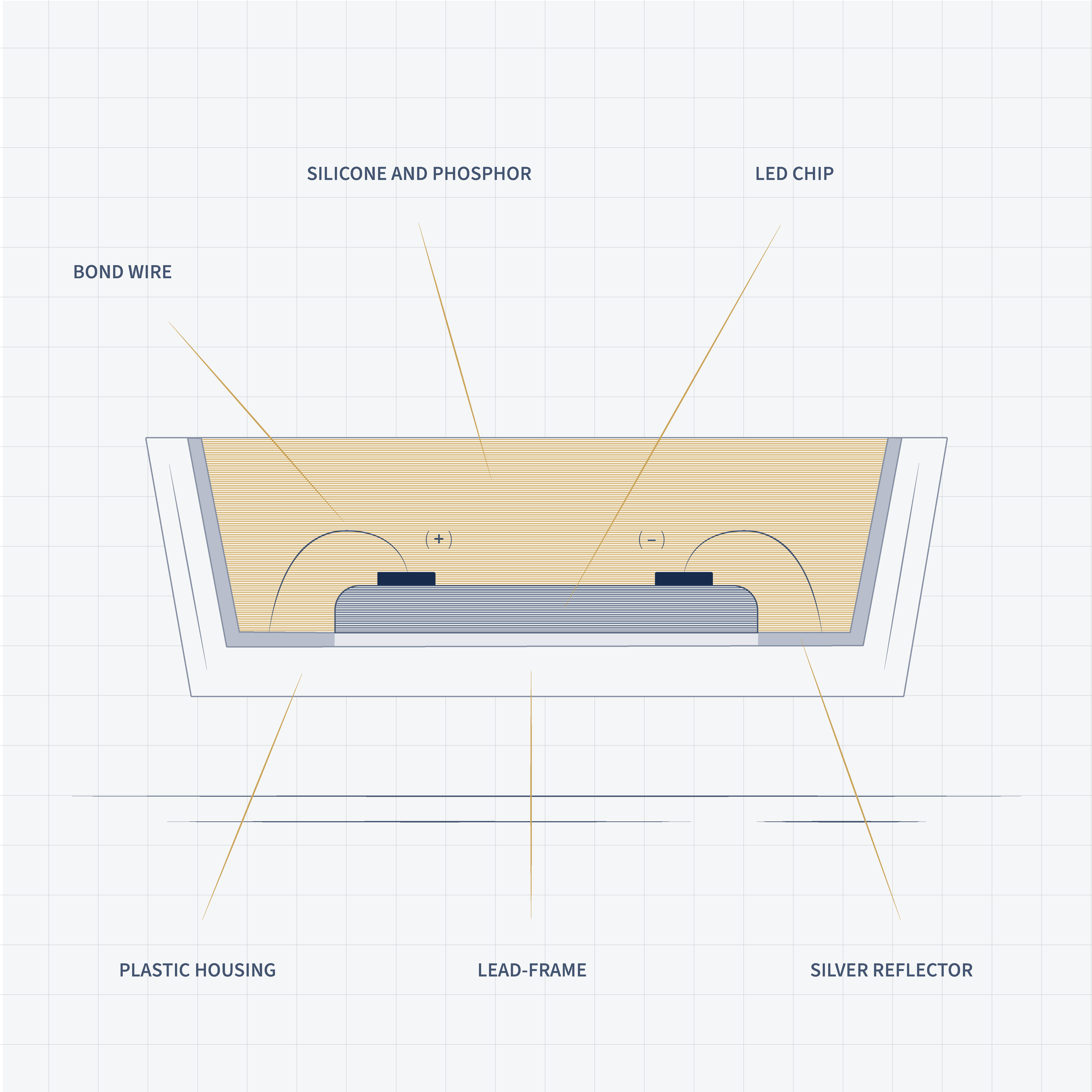 In order to extract the maximum amount of light, the cladding is often covered with a thin coating of silver that serves as a reflector. This type of LED is not suitable for harsher environments, such as outdoors, as silver can react with and be discoloured by aggressive gases. Discolouration results in a dramatic reduction of the LED’s performance and light output and a change in colour temperature.