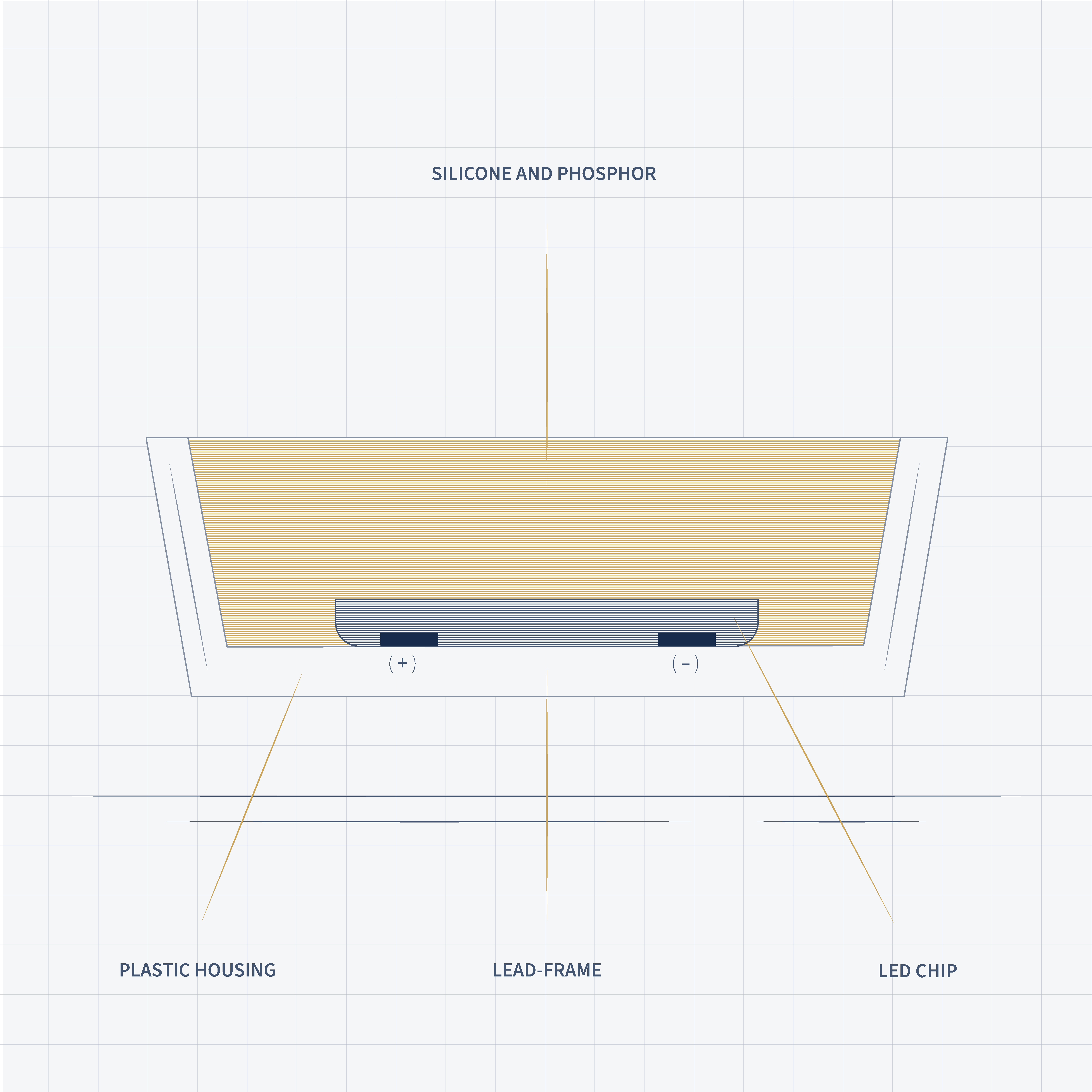 A mid-power LED is basically a cladded polymer-based package with a blue chip at the bottom. The cavity is filled with phosphor and silicone, which converts the blue light into white. The chip is powered by two wires (often gold) that connect to the top of the chip.