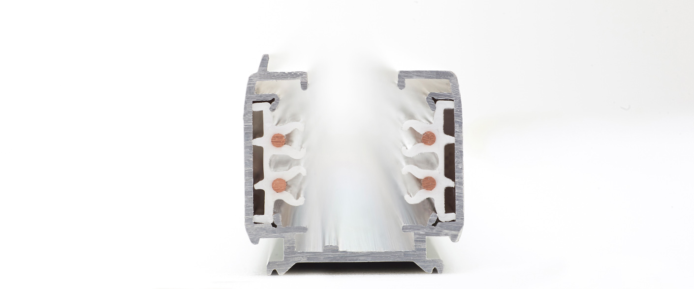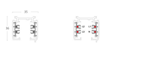 Skinne med 4 ledere: 3 faseledere og 1 nulleder. Jording ligger i profilen i skinnen. Tilpasset 230V, 3x16A, maks 3,68 kVA.