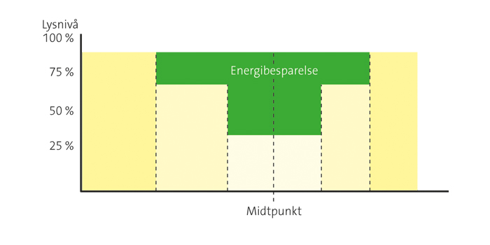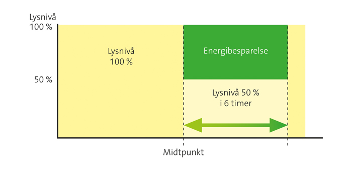 Systemet beregner midtpunktet for den lyssyklusen anlegget er tent og regulerer deretter ned fra 100 prosent til 50 prosent i 6 timer fra midtpunktet. Når 6 timer er gått, reguleres anlegget opp igjen til 100 prosent.