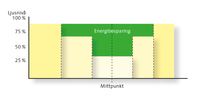 Systemet erbjuder upp till 5 flexibla ljusnivåer som kan sättas för valfri tid. Detta möjliggör mycket låga ljusnivåer mitt i natten, högre ljusnivåer när det behövs och medelhöga nivåer under övergångsperioderna. Systemet arbetar utifrån en mittpunkt som baseras på den totala tid armaturen ska vara tänd. Energibesparing: beroende på ljusnivå och tid.